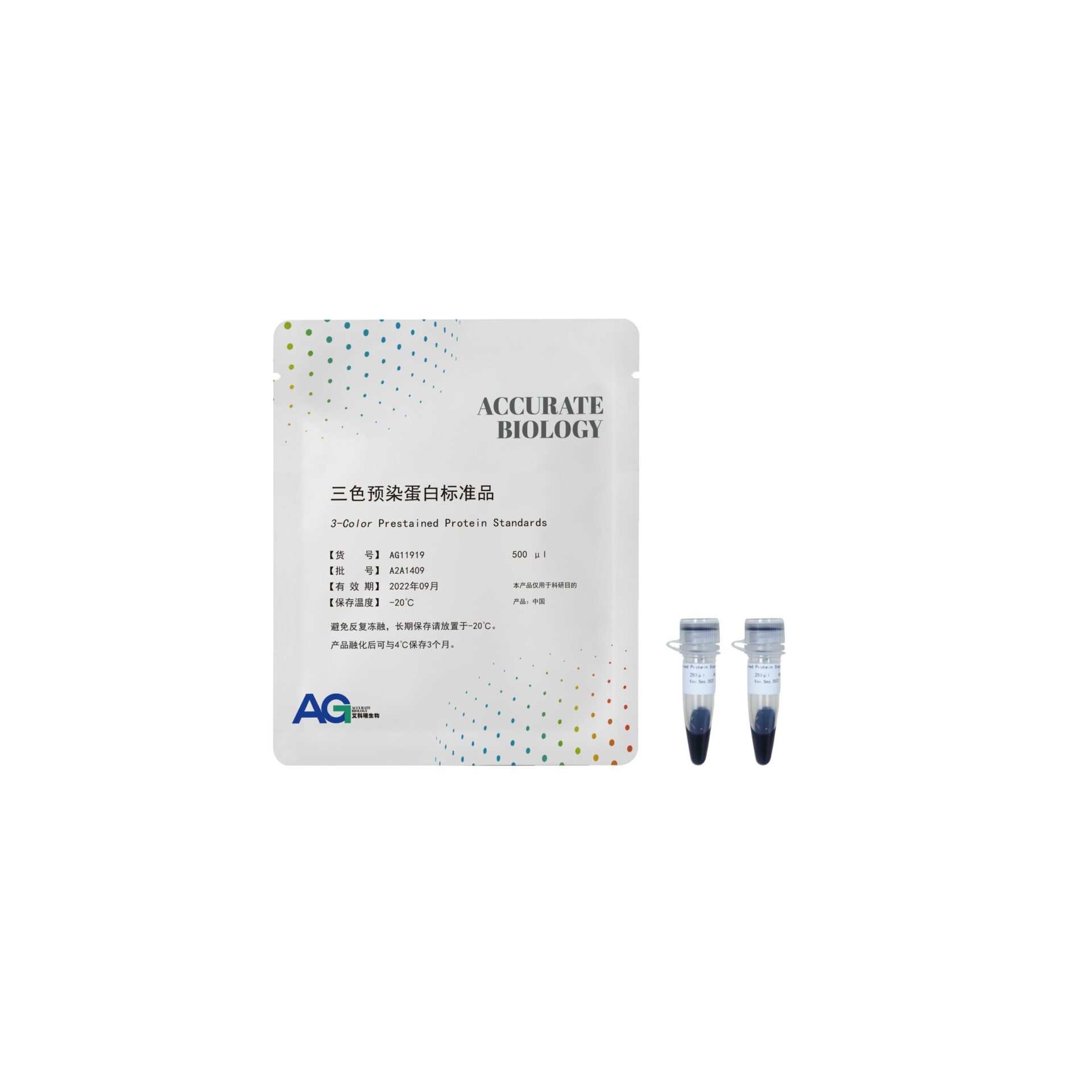 本制品是一种即用型三色预染蛋白标准品,无需加热、稀释和加入还原剂即可上样电泳。本制品适用于 SDS – PAGE 凝胶电泳和蛋白转膜实验。本制品由 10 种预染蛋白质组成,每种蛋白质的浓度为 0.1 ~ 0.4 mg / ml ,在 Tris-Glycine 缓冲液条件下分子量范围为 10 ~ 180 KDa,其中 25 KDa 条带呈绿色,75 KDa 的条带呈红色,其余均呈蓝色。本制品可用于判断目的蛋白的分子量大小,同时方便实时观察电泳状态及转膜效率。