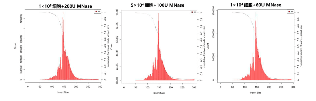 1. 高特异性:MNase Enzyme 精准消化裸露 DNA,保留完整核小体 DNA 片段(~150 bp大小的单体峰显著)。