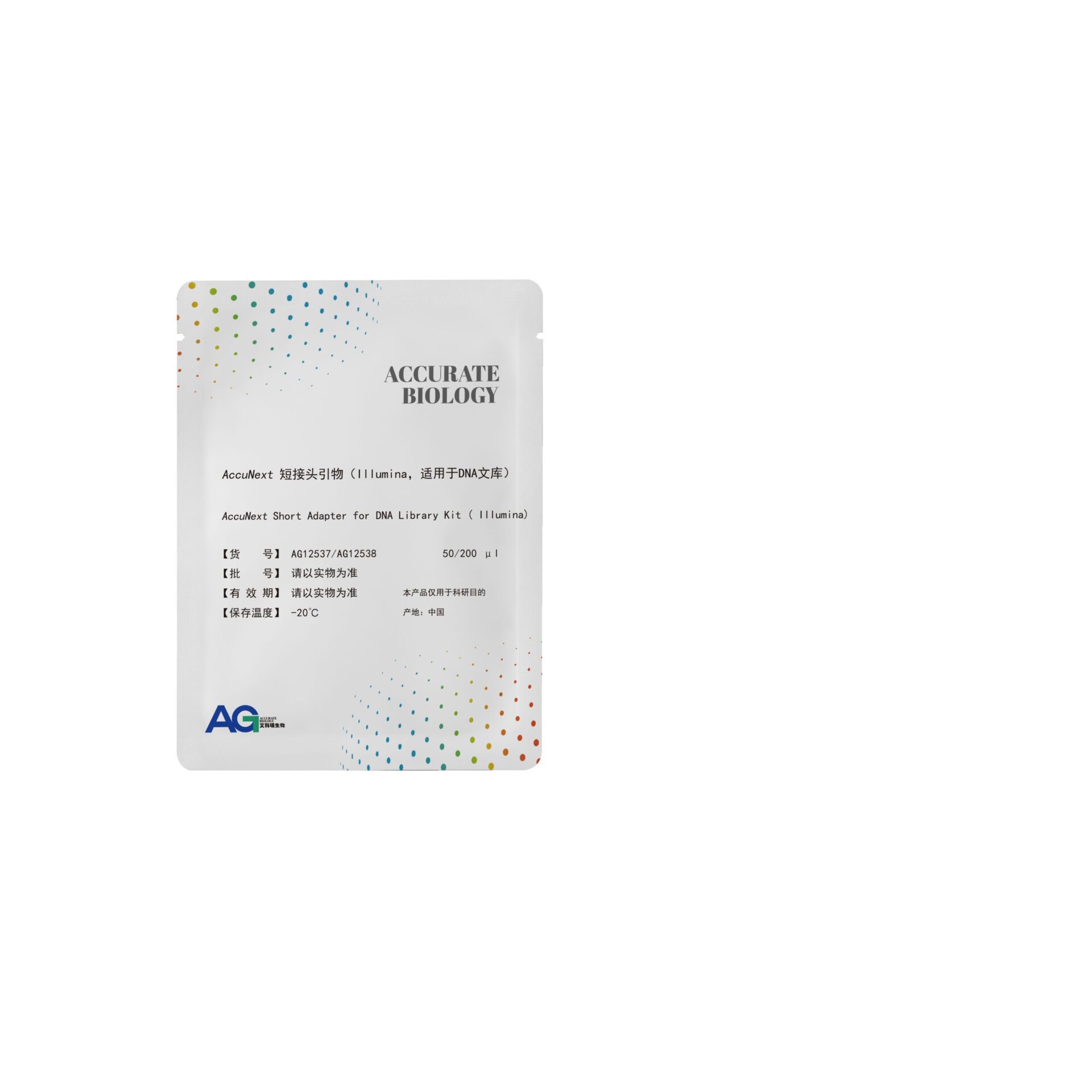 通过 TA 连接方式连接到 DNA 片段上后(经过末端修复,5’端为磷酸基团,3’端加上 dA 尾的 DNA 片段),使用与短接头互补的引物进行 PCR 扩增,形成完整的文库结构后上机测序。 DNA 建库产品可使用 AccuNext DNA Library Prep Kit for Illumina (Code No. AG12535 / AG12536) 或其他等效产品;与短接头互补的 PCR 扩增引物可使用 AccuNext CDI Oligos for DNA Library Kit ( Illumina)(Code No. AG12529 / AG12530 / AG12531)或其他等效产品。