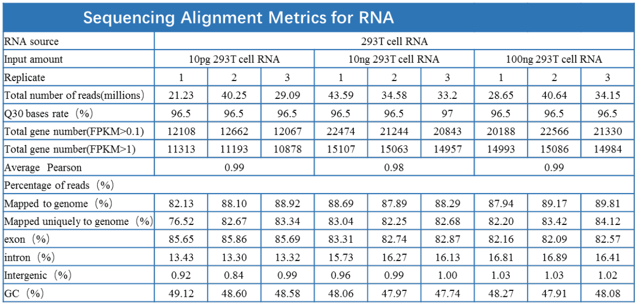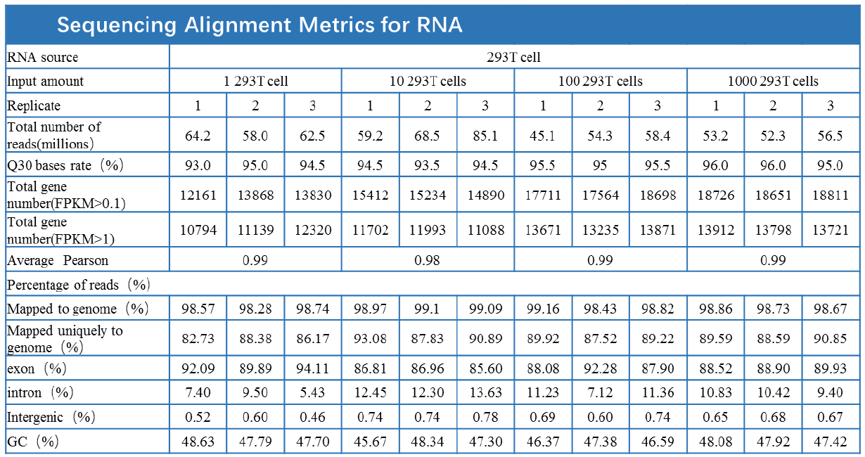 用本产品分别对 1 – 1000 个 293T Cell 及 10 pg – 100 ng 293T Cell RNA 进行反转录及 PCR 扩增,然后以 PCR 产物构建 DNA 文库,使用Illumina NovaSeq 6000 系统测序,数据如下:
