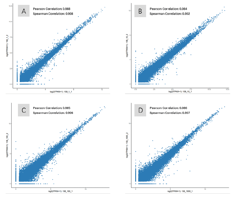 以 1 ~ 1000 个293T Cell 为模板,用本产品进行反转录及 PCR 扩增,然后以 PCR 产物构建 DNA 文库,使用 Illumina NovaSeq 6000 系统测序,做两次重复实验,两次结果的基因表达相关性很高,实验重复性好(图4:A为1 cells、B为10 cells、C为100 cells、D为1000 cell)。
