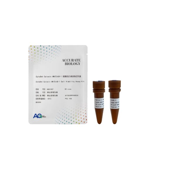 本产品是一款基于 Calcein AM 和 EthD-1 的双荧光染色法检测细胞活力的试剂盒。Calcein AM 与 EthD-1 可分别对活细胞与死细胞进行染色检测,其原理是 Calcein AM 有很强的疏水性,能够轻易穿透细胞膜进入细胞内,进入活细胞后被酯酶水解为 Calcein 留在细胞内,产生强烈的绿色荧光(Ex / Em = 494 nm / 517 nm);EthD-1 是一种高亲和性的核酸荧光染料,不能穿过活细胞膜,但能穿过死细胞膜到达细胞核,与死细胞的核酸结合产生强烈的红色荧光(Ex / Em = 528 nm / 617 nm);因此活细胞呈现绿色荧光,死细胞呈现红色荧光。
