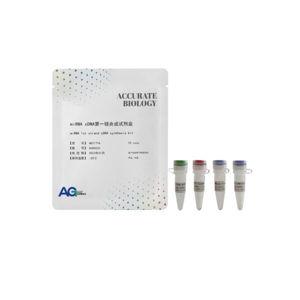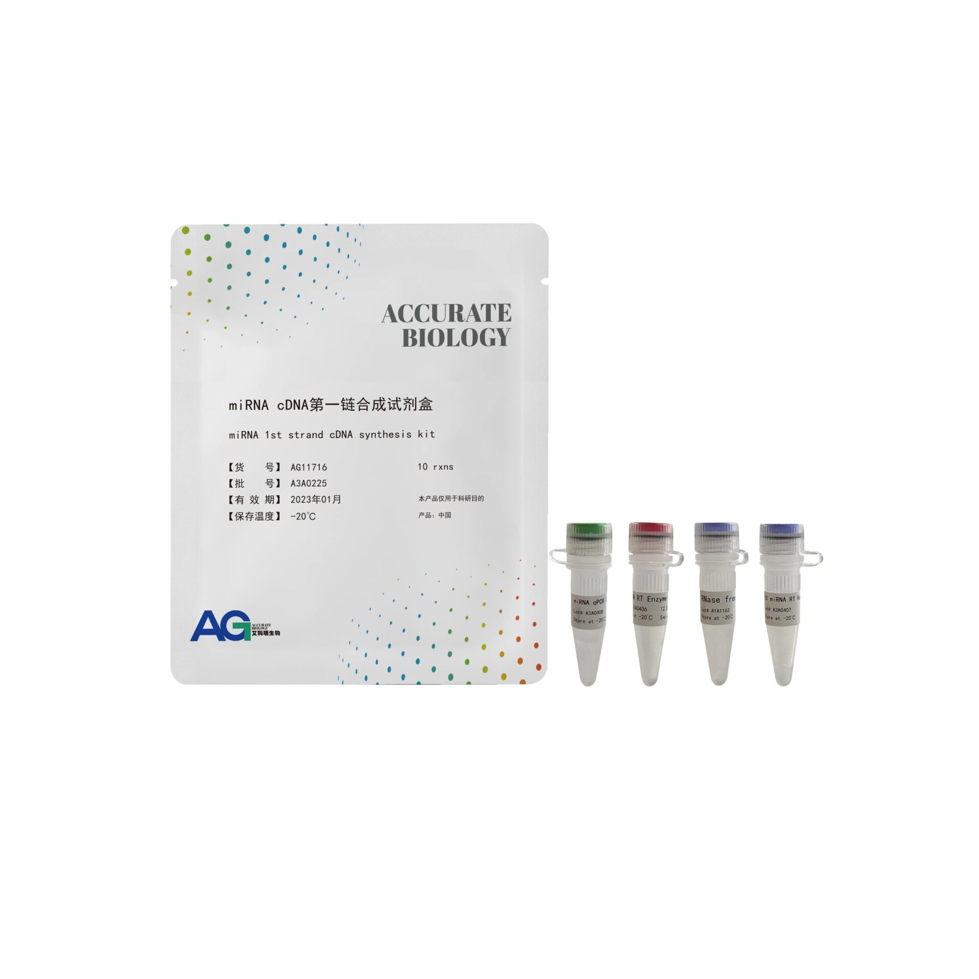本制品是应用加 A 尾法进行 miRNA 第一链 cDNA 合成的试剂盒。先使用 Poly ( A ) Polymerase 在 miRNA 3’末端加 A 尾,再使用通用反转录引物【带有特定标签的 Oligo (dT)引物】进行反转录反应,最终生成 miRNA 的第一链 cDNA。该制品中 miRNA RT Enzyme Mix 包含加 A 尾酶和反转录酶,2X miRNA RT Reaction Solution 含有通用反转录引物,经过优化,在同一反应体系中同时高效的完成加 A 尾和反转录反应,简化了实验操作流程,可减少试剂损失及实验误差。本制品适用于 Total RNA 或 small RNA 等包含 miRNA 样品的反转录。