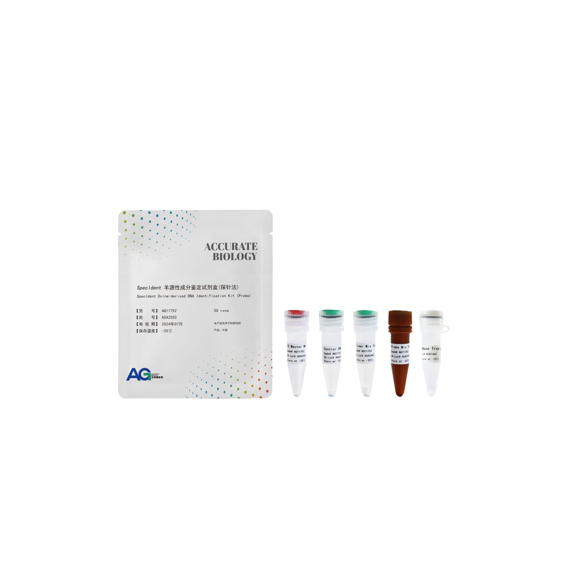 本产品中 2X Master Mix for Ovine 已混有 DNA 聚合酶、dNTP Mixture 与反应 buffer,反应液配制十分简单,只需加入本产品中的 Primer Mix for Ovine、Probe Mix for Ovine、RNase free water 以及加入待检样本即可进行牛源性成分的鉴定。